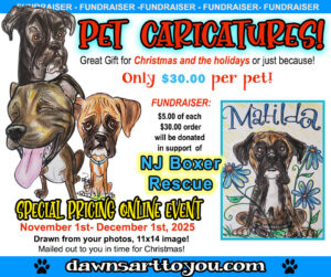 Pet Caricature FUNdraiser with Dawns Art To You-*ENIRE MONTH OF NOVEMBER* November 6, 2025 No Comments FUN FUNDRASIER ALERT! (starting November 1st) $5 from each caricature will be donated back to NJBR! You will be asked Read More »